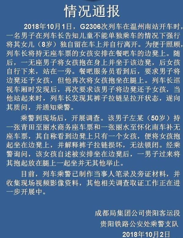 高铁一男子将陌生女童抱坐腿上被发现裤拉链拉开,乘警正调查