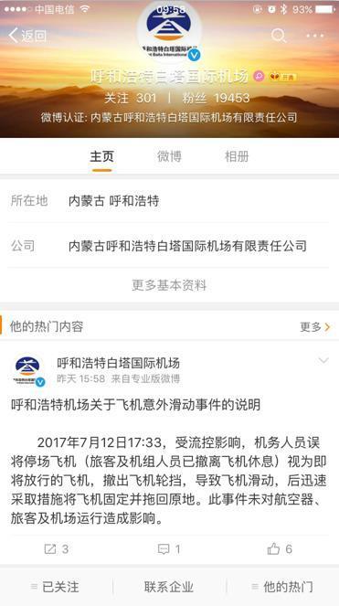 呼和浩特白塔机场一飞机意外倒滑 机务人员用轮